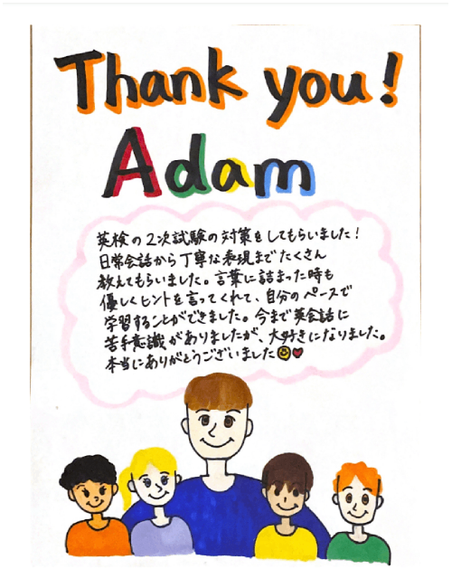 でもAdam先生とのやりとりで話す事への抵抗が少しなくなり避けていた英語を勉強してみようと思いました!